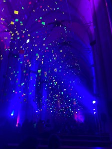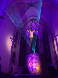 In the Land of Luther, where today only some 6% of the population have an active Christian faith, how would you go about connecting people with the centrality of Christianity? You could hardly do better than what the Liebfrauen-Überwasser church in Münster has done in their temporary LUX3 exhibition. For starters, this 800-year-old church is in a very picturesque part of town, full of buildings centuries old. Right now there is a Christmas market all around it, drawing thousands of people, including the Tiews family. We had heard there was some kind of art exhibition there, so we decided to check it out. Even in the cold and frosty air (31 F), there was a long line to get in. Once inside, I looked up to see thousands of differently colored Plexiglas squares and laser beams emanating from the altar. A familiar tune wafted through the ancient building: “The Power of Love” by 1980s pop group “Frankie Goes to Hollywood.” (Really?