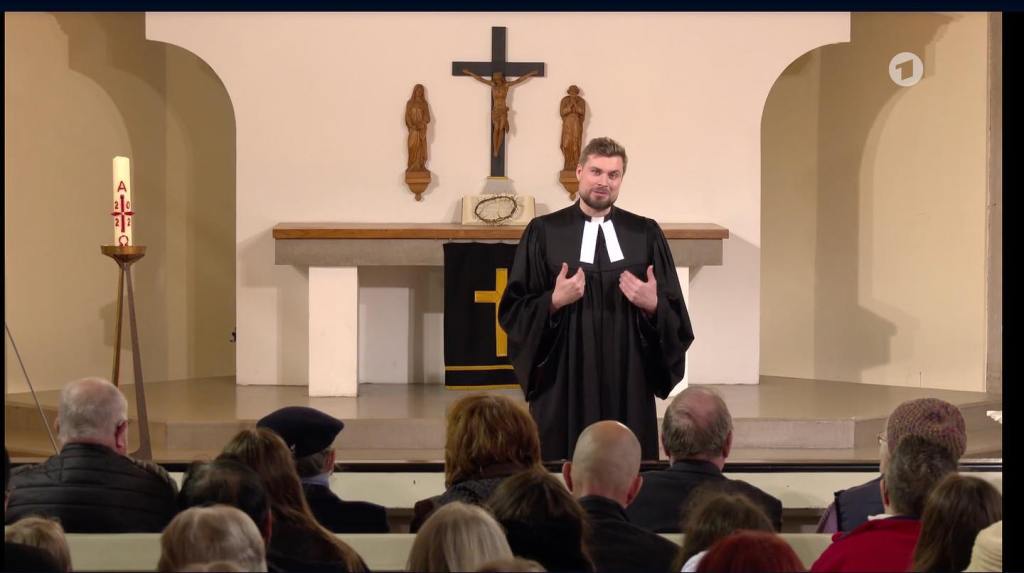 “‘I have kept for myself seven thousand men who have not bowed the knee to Baal.’ So too at the present time there is a remnant, chosen by grace” (Romans 11:4-5). You may recall that a few days ago I commented on the sorry state of affairs in Germany’s Protestant “state church,” which is known for its often-anemic theology, a heavy saturation of liberal teaching, and tragically low church attendance. But thankfully, the Lord has preserved for himself a remnant of faithful pastors within that church body. One of them is Rev. Dr. Malte Detje, the pastor of the Kreuzkirche in Hamburg-Kirchdorf (which ironically means “church village”), a neighborhood tucked in between port facilities south of the Elbe River. Yesterday morning, Pastor Detje, who is known in some circles for his “Tischgespräche” (Table Talks) podcast and YouTube messages, was on German national television, officiating the Good Friday service at the Kreuzkirche. The church was packed. Pastor Detje conducted a wonderful, doctrinally faithful service. I was impressed that he needed no notes, even chanting the Introit from memory. He was most winsome in his delivery, giving a fine, theologically sound sermon. He made the Law very personal using several examples, but then showered his congregation and the viewers with the Gospel, explaining that precisely because our Lord took our sins upon Himself—excruciating for Him—this Friday is “good” for us. Interestingly, he placed Confession and Absolution *after* the sermon, a clever approach for those perhaps unfamiliar with a traditional Christian service, but who may have been convicted by the Law in the sermon and would have needed, once again, Absolution directed squarely at them. I would love to know how many viewers may have heard the Christian message for the first time in that broadcast. Thank you, Lord, for preserving for Yourself—in a decidedly post-Christian land—a remnant of faithful pastors. (For those wishing to view the service, click on the picture below.)