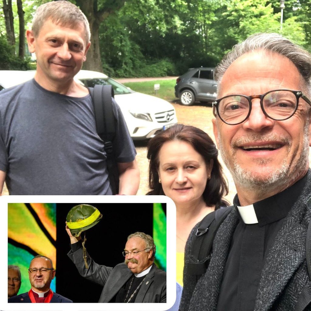 Only weeks after Russia invaded Ukraine, I was asked to welcome and assist Ukrainian refugees—a mother and daughter from Dnipro. I met them on a cold rainy night at Hamburg’s central station. They quickly recognized the cardboard Ukrainian flag I had prepared. Exhausted after three days of travels, they hugged me—tears in their eyes, grateful for their safe arrival. A nurse by profession and also multilingual, Lyubov immediately started teaching newly arrived Ukrainian nursing students the German language. The Bishop of the Evangelical Lutheran Church of Ukraine (ELCU), Rev. Serge Maschewski, knew Lyubov and soon asked her to reach out to the LCMS, to explore whether we might provide supplies for ELCU churches: Communion ware, warm clothing and shoes, etc, but also helmets and bulletproof vests for ELCU pastors providing pastoral care on the battlefield. Lyubov and I teamed up with Viktor Bender, a Russian (!) living in Germany, and together we procured the desired items (see my FB posts of 3/30 and 6/21, 2022). Fast forward to the LCMS Convention: As a token of appreciation for our newly resolved church fellowship and also for the much-needed supplies, Bishop Maschewski presented LCMS Pres. Rev. Dr. Matt Harrison with a helmet that, as it so happened, Lyubov, Viktor, and I had procured. The Bishop had worn it while visiting his parishioners fighting on the front lines. On one occasion, a drone struck and he was hit by fragments. Even though the attack blinded him for 20 days, the helmet saved his life. In fact, that same helmet was later worn by another ELCU pastor, who was likewise struck but who also survived. Praise God for Lyubov and the many ladies around the world like her: strong, dignified, and—thanks to her faith in Jesus Christ—full of courage in the face of adversity (Pr 31:25)—and sometimes even saving lives in the process.