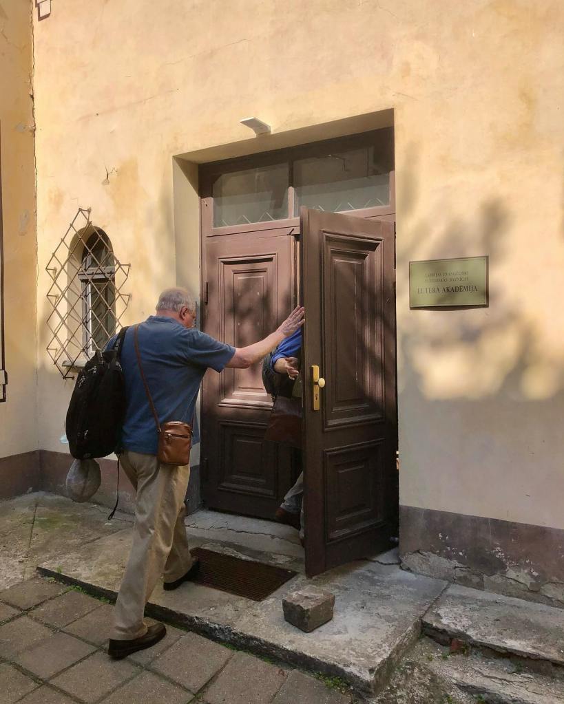 Last Sunday, “Mohammad” and I were talking about how Riga Luther Academy is looking for men wishing to become pastors. “I *do* want to become a pastor and teach people about Jesus,” he replied. “But I can’t go to seminary…I’m a sinner.” Riga Luther Academy—the online English-language Lutheran seminary where several of LCMS missionary colleagues and I teach—is enrolling more and more students—men and women from some 20 different countries, all desiring to become Lutheran pastors or deaconesses. Mohammad’s hesitation to enroll because he is still a sinner gave me pause. He understands the basics of Christianity quite well and knows His Scripture. Case in point, in Bible class recently we were discussing how the Holy Spirit raises spiritually dead people to new life and he offered the parallel passage of the famous “dry bones” in Ezekiel 37. Wow. So, on the one hand, Mohammad is right. Of course, he’s a sinner—we all are. And that Old Adam will sadly remain shackled to us until we leave this earth. On the other hand, a key point of Christianity is precisely that our Lord placed His righteousness over us in our Baptism, covering all our sins. “Simul iustus et peccator,” as the Reformers said. Therefore, men and women who are gifted in understanding Scripture and have a desire to become pastors or deaconesses should truly consider taking the plunge. Even though they are still sinners. For “the harvest is plentiful, but the laborers are few” (Mt 9:37). Let us pray that Mohammad will realize that the Lord has covered *his* sins too and may very well want him to become one of His undershepherds. And let us pray also for our young men and women stateside, that they also would consider enrolling in one of our two fine LCMS seminaries. Because the workers are indeed few—all over the world. (Illustration: Rev. Dr. Charles Cortright walking into Riga Luther Academy).