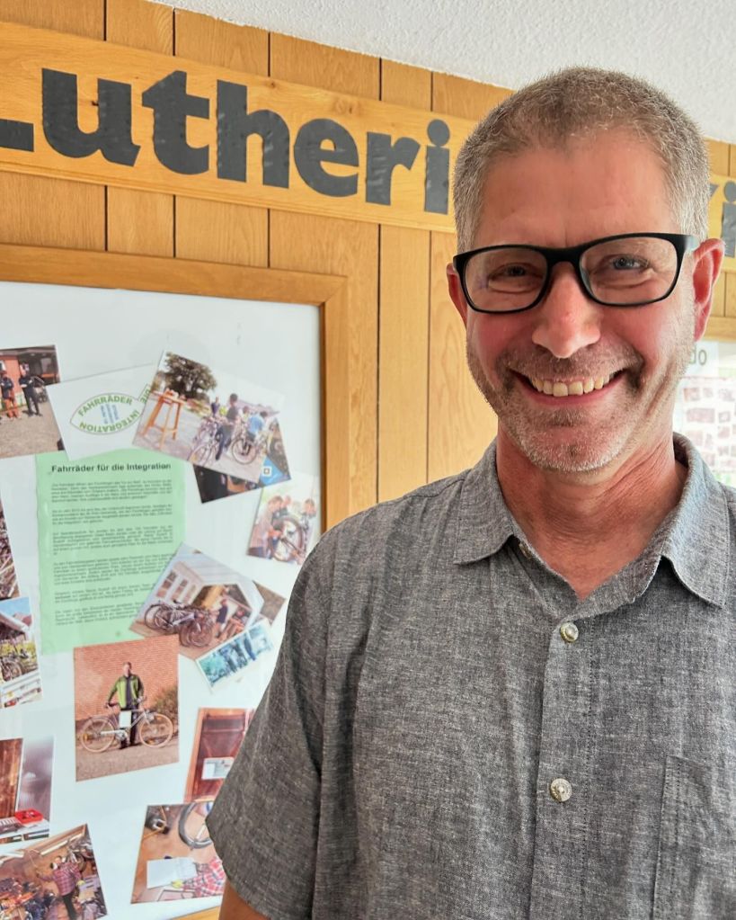 “The Spirit himself bears witness with our spirit that we are children of God” (Romans 8:16). Last Sunday, Rev. Christian Rehr of St. Peter’s Lutheran Church (SELK), Stelle—a small town near Hamburg—invited me as their guest preacher and speaker on Mission Sunday. Afterwards I got to meet church member Rainer Rudloff, who runs a unique service for immigrants in the area. Over the last few years, Germany has taken in millions of asylum seekers. Refugee camps are scattered all over the country, even in Stelle—in this case, however, two miles outside of town. The local refugees are isolated from shops and have no chance to integrate with the town folk. To address this issue, St. Peter’s decided to offer inexpensive bicycles to refugees and asked Rainer, a mechanic by profession, to head up this ministry. Over the years, the church team has received hundreds of bicycles from the community. Rainer and his team bring them up to snuff and provide them for a nominal fee. One day, a refugee from Pakistan, who desperately needed a bicycle, asked him, “Why are you helping people you don’t even know?” Rainer replied that providing inexpensive bikes to refugees is something that his organization is chartered to do. “Hmm, I get it: Jesus…!” he responded, breaking into a wide grin. “You’re Christians and you’re doing this because Jesus told us to love one another. I’m Christian, too.” The two men looked at each other for a second—and hugged. Unbeknownst to them, a lady in the corner overheard their conversation. After the refugee had left, she stepped up to Rainer and said: “I’m an atheist. I don’t care a lick about Jesus. But I must say that did you just did something really big for Christianity.” Indeed, we Christians live in a fish bowl. But thank you, Lord, for all the opportunities You provide so we can witness to people, even by simple actions. Yet in reality, it is the Holy Spirit in us who bears witness that we are the children of God, even if we might not realize that He is doing so (Image: Rainer with a bulletin board depicting St. Peter’s bicycle ministry).